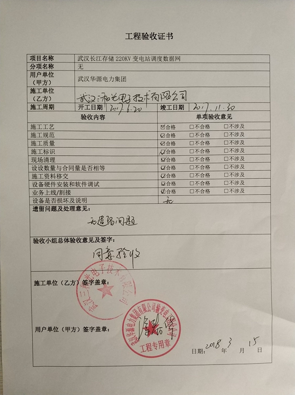 武漢東湖新技術(shù)開發(fā)區(qū)國家存儲器基地長江存儲220KV變電站調(diào)度數(shù)據(jù)網(wǎng)項(xiàng)目驗(yàn)收!