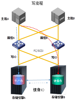 對(duì)稱雙活在寫IO的時(shí)候,生產(chǎn)覺、鏡像卷可同時(shí)接受寫IO,鏡像卷的寫IO會(huì)通過鏡像通道傳到對(duì)端引擎,完成寫操作。在讀IO的時(shí)候,生產(chǎn)卷、鏡像卷可同時(shí)響應(yīng)度IO,并發(fā)讀寫。如圖3.4所示。