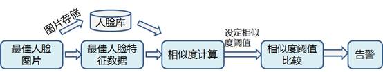 人臉分析服務(wù)器對(duì)前端IPC上傳的人臉序列進(jìn)行最佳人臉計(jì)算,對(duì)該最佳人臉進(jìn)行人臉特征分析,提取相應(yīng)的人臉信息,并將最佳人臉圖片及人臉特征數(shù)據(jù)進(jìn)行存儲(chǔ),后對(duì)照內(nèi)部?jī)?chǔ)存的人臉信息庫(kù)進(jìn)行篩查比對(duì),根據(jù)要求進(jìn)行相應(yīng)聯(lián)動(dòng)告警。