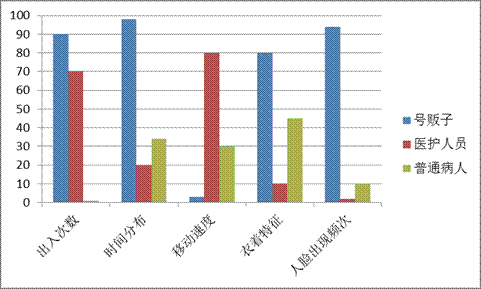 號(hào)販子:頻繁出入掛號(hào)大廳、醫(yī)院出入口活動(dòng)時(shí)間呈均值分布、移動(dòng)速度小,呈“守候性”行為特征、衣著特征固定,掛號(hào)機(jī)、人臉出現(xiàn)頻繁