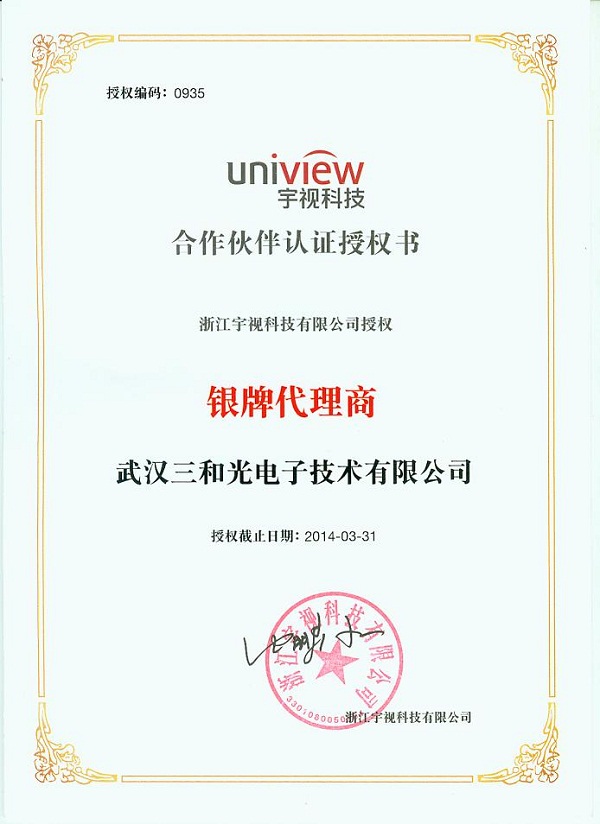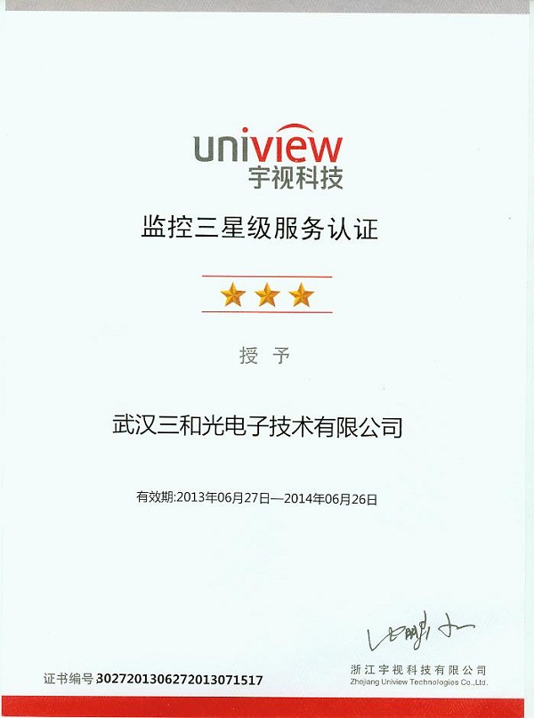 宇視三星級服務(wù)資質(zhì)認證2013-2014