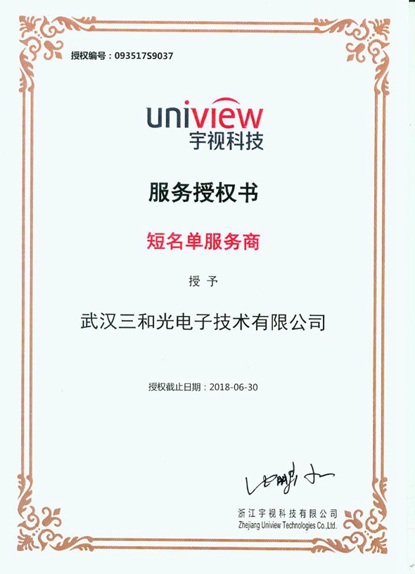 宇視科技短名單服務(wù)商授權(quán)書(2017-2018)