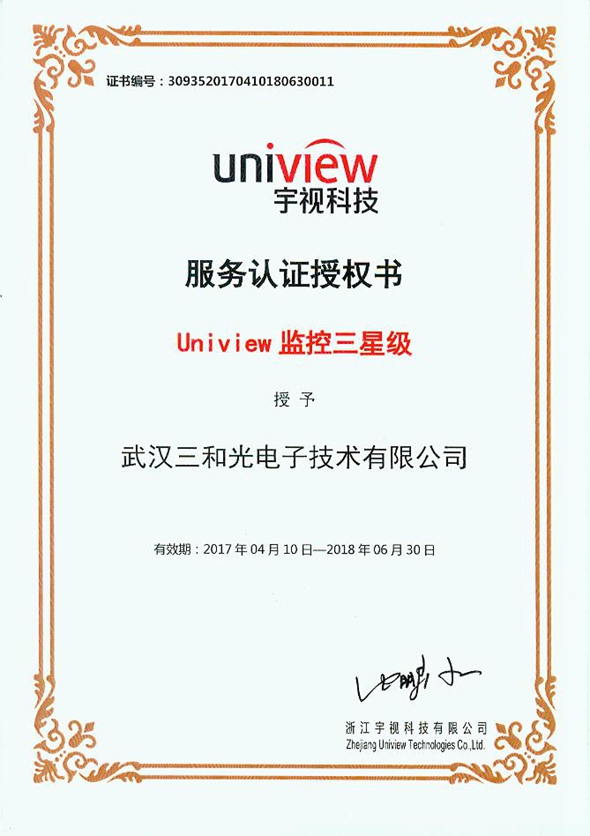 宇視科技監(jiān)控三星級服務(wù)認證授權(quán)書(2017-2018)