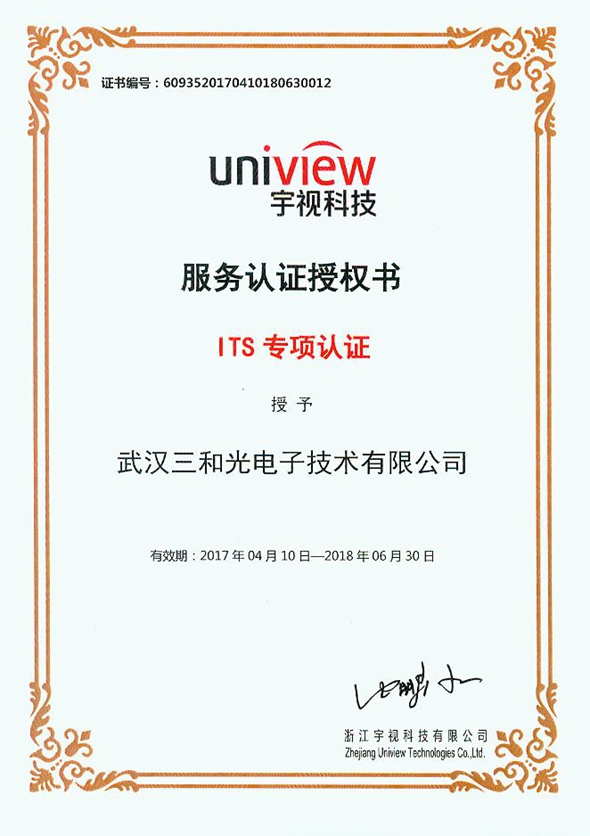 宇視科技ITS智能交通專項認證服務(wù)授權(quán)書(2017-2018)