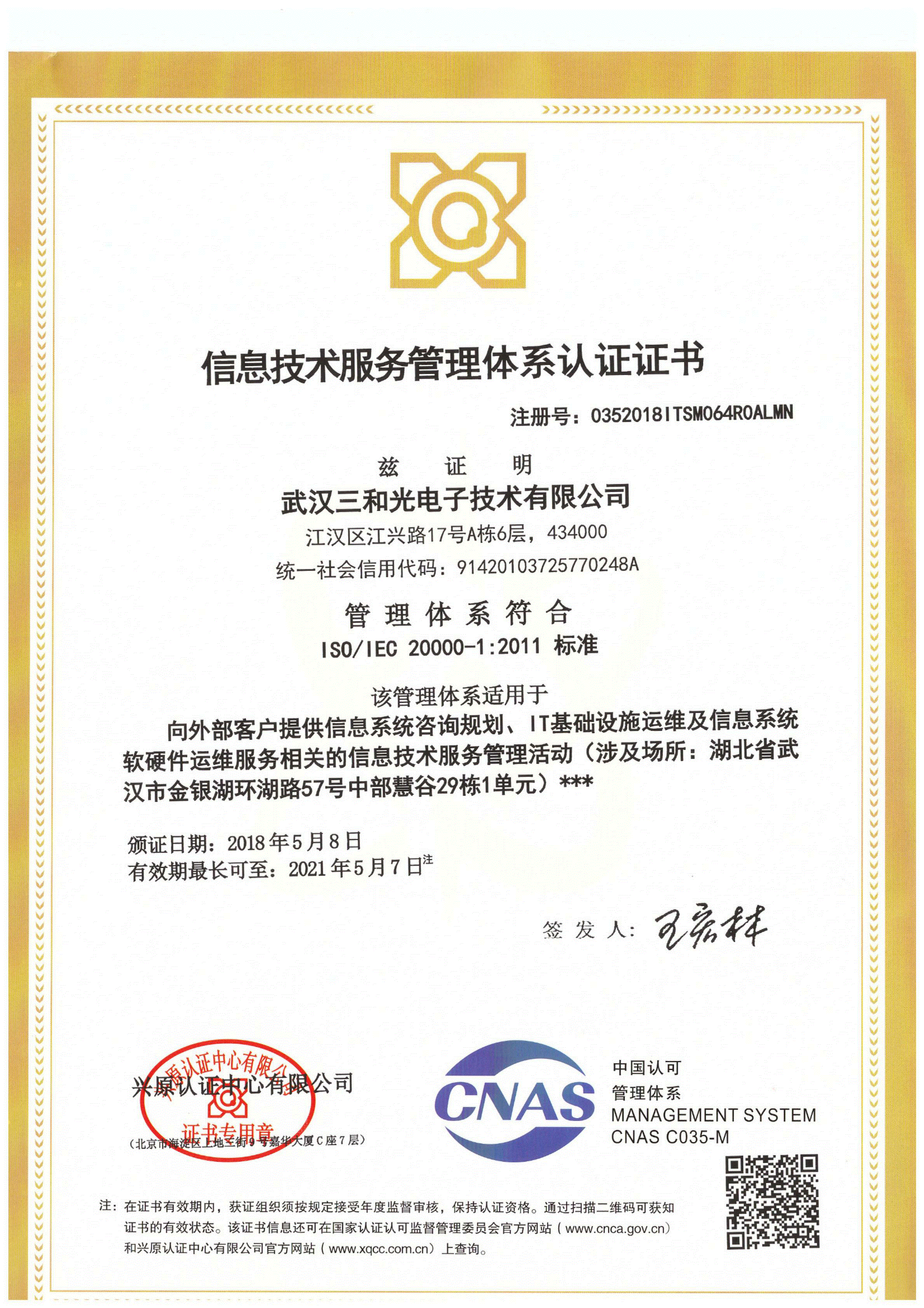 ISO20000信息技術(shù)服務(wù)管理認證證書